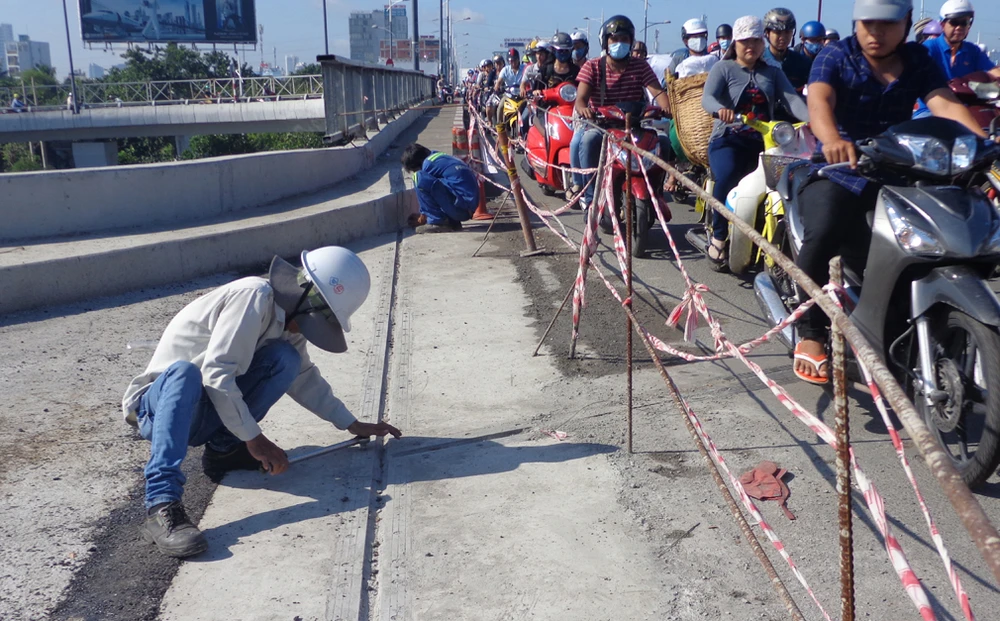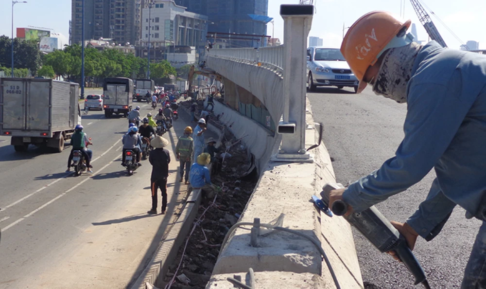 Trong ảnh: Công nhân đang hoàn thiện lan can ở nhánh rẽ hình chữ S từ đại lộ Võ Văn Kiệt lên cầu Nguyễn Văn Cừ.