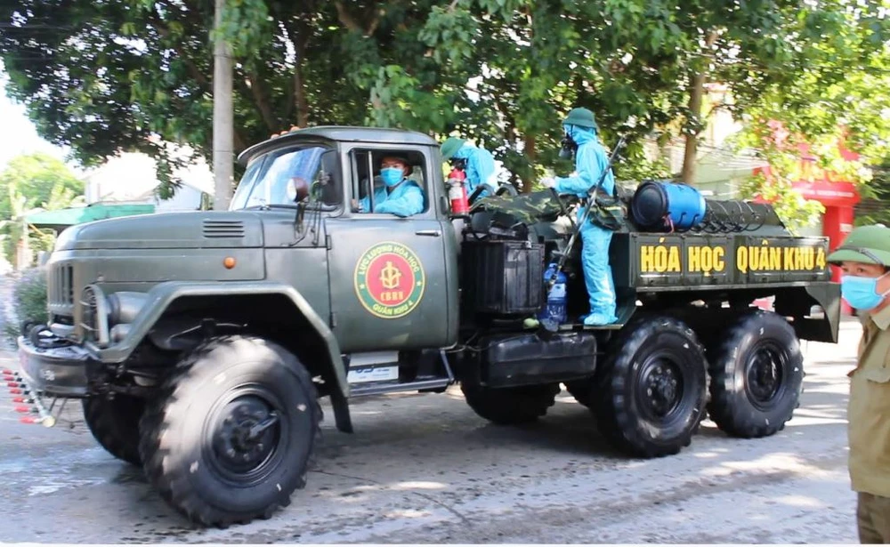 Sáng 16-6, lực lượng Quân khu 4 phun hóa chất khử khuẩn trên đường Nguyễn Gia Thiều giao nhau với đường Ngô Quyền (phường Hưng Dũng, TP Vinh).