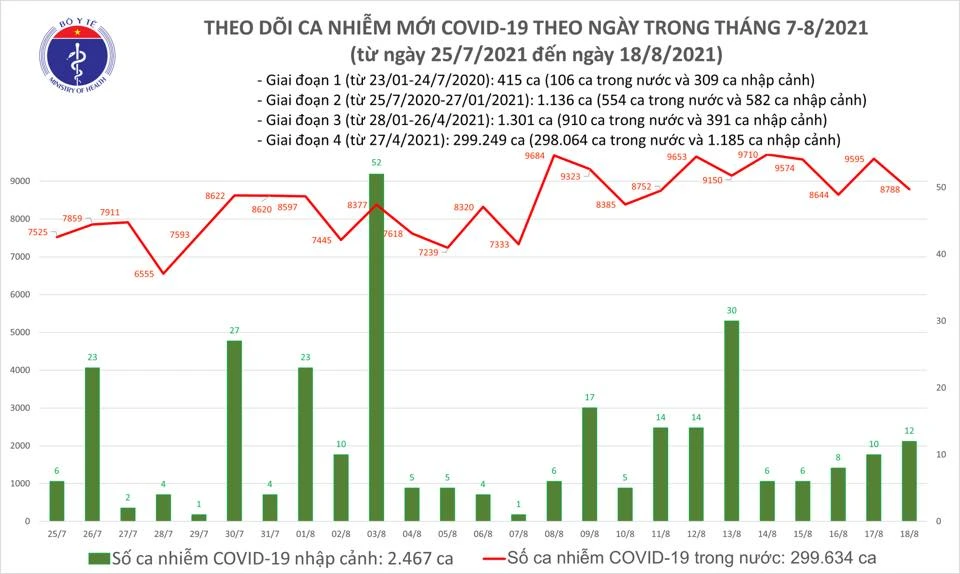 Tối 18-8, Bộ Y tế cho biết tính từ 18h ngày 17-8 đến 18h30 ngày 18-8, trên Hệ thống Quốc gia quản lý ca bệnh COVID-19 ghi nhận 8.800 ca nhiễm mới gồm 12 ca nhập cảnh và 8.788 ca ghi nhận trong nước trong đó có 5.935 ca trong cộng đồng