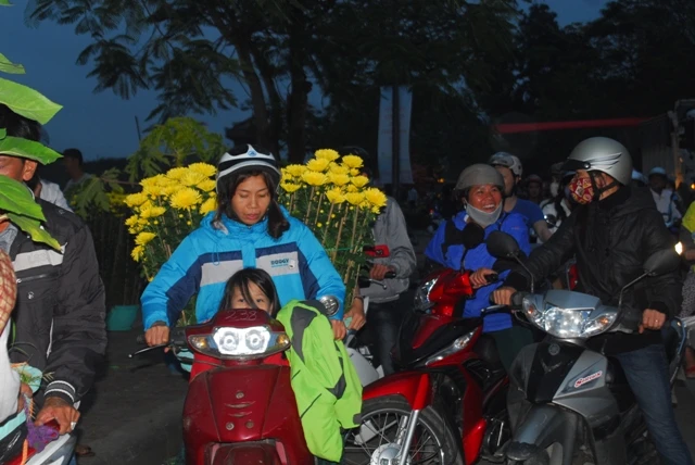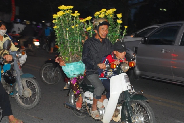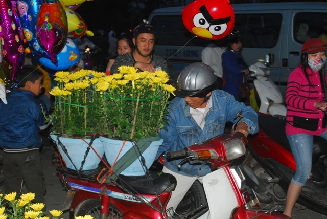 Những chậu cúc được người dân mang trên đường