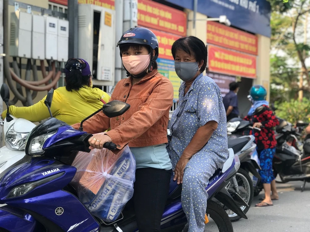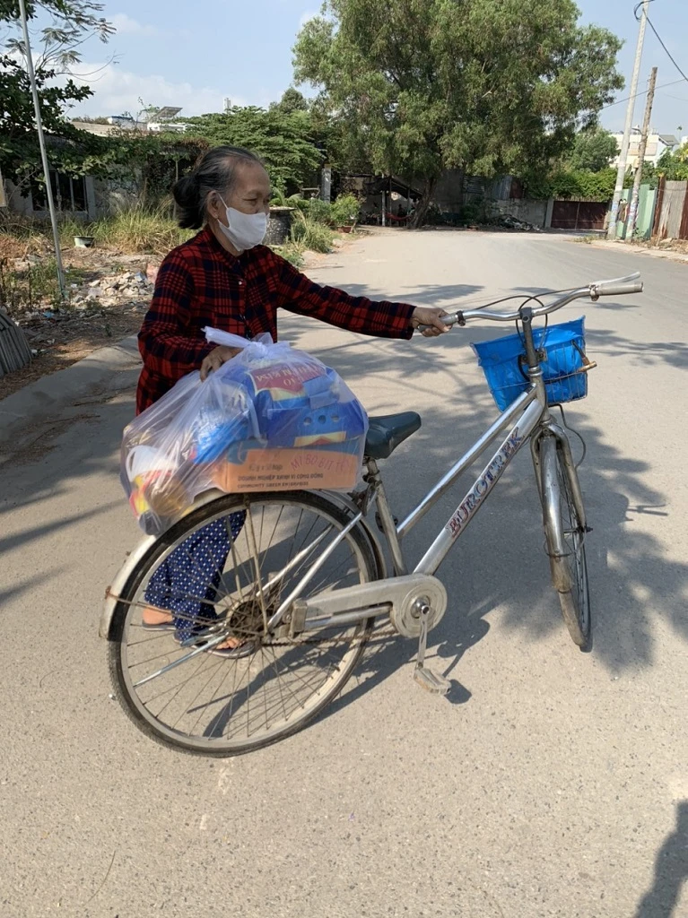 Sợ bà Hà đi bộ sẽ vất vả, một nữ công nhân sống cùng dãy trọ đã chở bà đến điểm nhận quà trên chiếc xe máy. Cùng đi còn có một người phụ nữ khác nữa, họ biết bà nên muốn đi cùng.