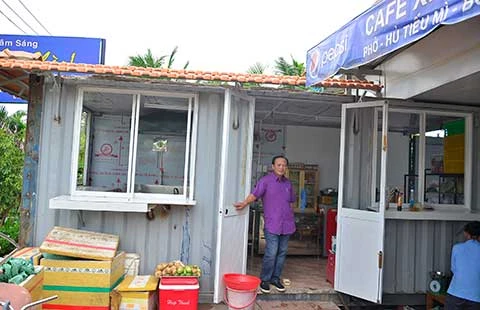 Ông Tấn với “nhà” container được đặt trong khuôn viên quán Xin Chào. Ảnh: PL