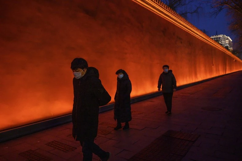 Người dân Bắc Kinh đi lặng lẽ trên con phố vốn đông khách du lịch gần quảng trường Thiên An Môn ngày 28-3. Ảnh: GETTY IMAGES