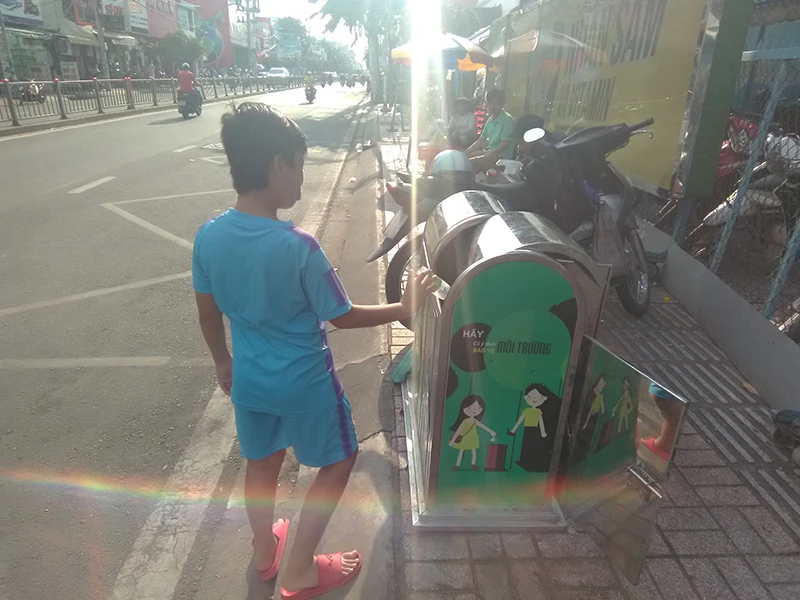 Một cậu bé biết phân loại rác tại trạm xe buýt gần vòng xoay Phú Lâm, quận 6, TP.HCM. Ảnh: THANH VŨ