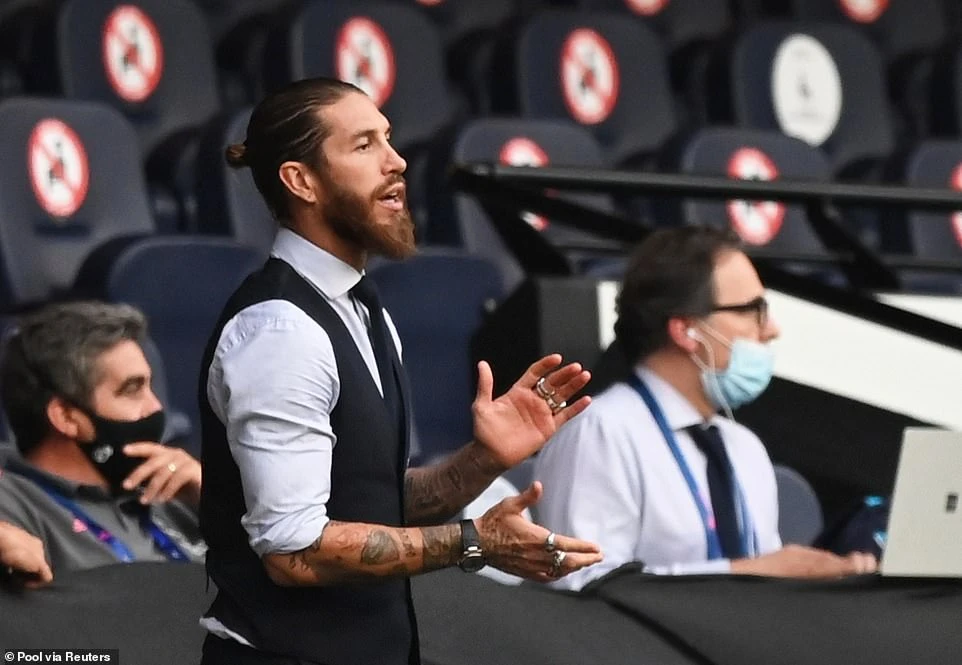 Ramos ngồi trên khán đài cổ vũ đồng đội. ẢNH: REUTERS