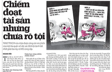 | Tóm tắt vụ việc Báo Pháp Luật TP.HCM ngày 18-2 phản ánh: Tối 24-7-2013, tại một quận ở TP.HCM, anh Phạm Hữu Hòa và bạn bè đang ngồi trước cửa nhà thì bị Trần Tiến Đạt cùng ba người bạn cầm dao, cây tầm vông… xông đến đuổi đánh. Nhóm của anh Hòa bỏ chạy, để lại hai xe máy. Nhóm của Đạt đuổi theo nhóm của anh Hòa không kịp nên quay lại. Thấy xe máy của anh Hòa đang cắm sẵn chìa khóa, nhóm của Đạt lấy luôn, đem bán được 2 triệu đồng (theo kết quả định giá, xe trị giá 2,5 triệu đồng) rồi trốn về An Giang và tiêu xài hết số tiền trên. Sau khi bị bắt, tại cơ quan điều tra, nhóm của Đạt khai rằng khi đang ngồi trước nhà thì nhóm của anh Hòa gồm bốn người đi trên hai xe máy chạy ngang rồ ga lớn. Cho rằng bị khiêu khích nên Đạt mới rủ cả bọn đi đánh nhóm của anh Hòa. VKS quận đã truy tố nhóm của Đạt về tội cướp tài sản theo khoản 1 Điều 133 BLHS. Nhưng TAND quận lại có quan điểm khác về tội danh. Theo tòa, hành vi của Đạt và đồng phạm không phù hợp các yếu tố cấu thành của tội cướp tài sản, nếu áp dụng nguyên tắc có lợi cho các bị cáo thì có thể đề nghị truy tố họ về tội công nhiên chiếm đoạt tài sản theo khoản 1 Điều 137 BLHS. Tuy nhiên, sau đó VKS vẫn bảo lưu quan điểm truy tố nhóm của Đạt về tội cướp tài sản nên TAND quận đã phải có công văn xin ý kiến của TAND TP.HCM. |