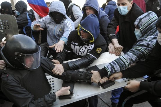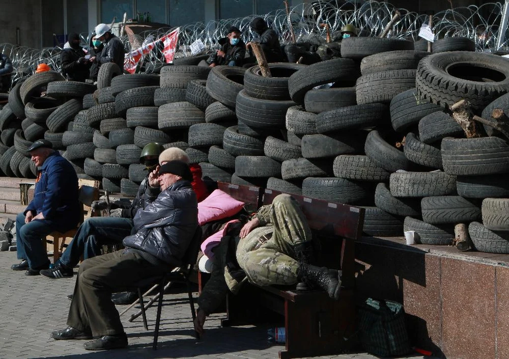 Những người ủng hộ nước Nga tiếp tục dựng hàng rào chắn bên ngoài tòa nhà chính phủ ở thành phố Luhansk. Lần này, họ mang mặt nạ, chuẩn bị cả bom xăng để sẵn sàng “ứng chiến” sau khi Kiev đánh động sẽ dùng vũ lực để trấn áp tình hình.
