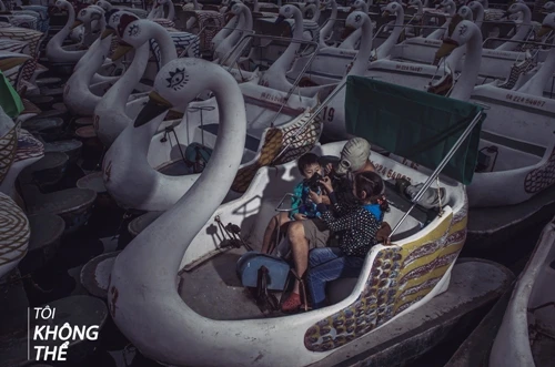 Ba cha con họa sĩ Cấn Ngọc Chúc chơi đạp vịt ở bờ Hồ Tây. Ảnh: Nhiếp ảnh gia VŨ BẢO KHÁNH