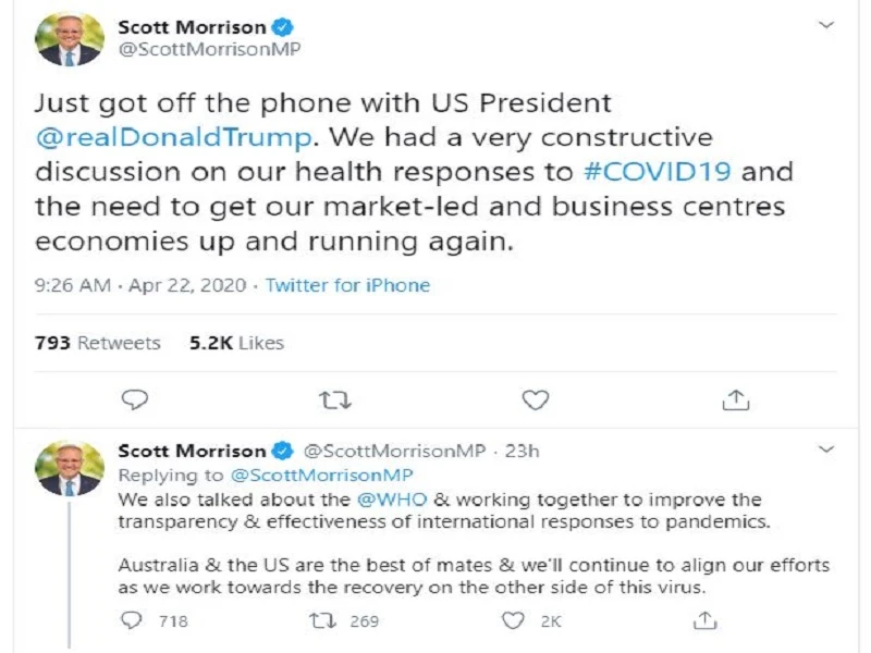 Trên trang Twitter của mình, Thủ tướng Morrison nói rằng mình đã có một cuộc thảo luận “mang tính xây dựng cao” với Tổng thống Mỹ Donald Trump về những phản ứng với đại dịch COVID-19 cũng như thúc đẩy nên kinh tế của hai nước.