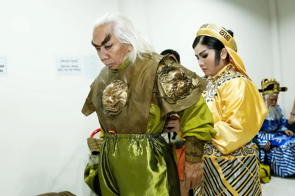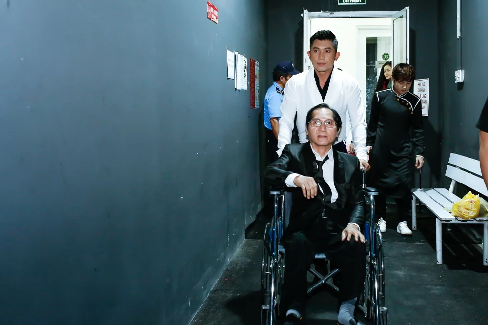 Nghệ sĩ Trường Sơn không quản tuổi cao bệnh tật đến giúp cháu. Phía sau ông là con gái ruột - nghệ sĩ Tú Sương đang chăm sóc cha.