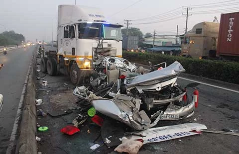 Một vụ tai nạn do xe đầu kéo container làm chết năm người trước khu chế xuất Linh Trung (TP.HCM). Ảnh: CTV