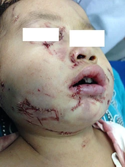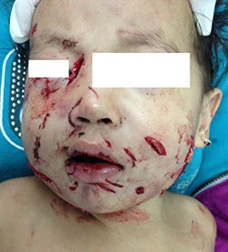 Khi khám cho bé, các bác sĩ thấy toàn bộ vùng mặt bên trái của bé có nhiều vết rách lớn nhỏ, có chỗ lòi cơ nham nhở. Đặc biệt, vành tai trái gần như đứt lìa, vết thương chảy rất nhiều máu.