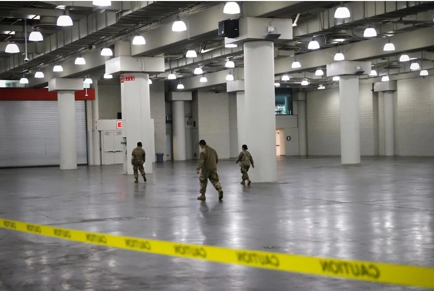 Binh sĩ Mỹ bên trong một trung tâm hội nghị sẽ sớm chuyển đổi thành một bệnh viện dã chiến điều trị bệnh nhân COVID-19 ở TP New York, bang New York (Mỹ) ngày 24-3. Ảnh: REUTERS
