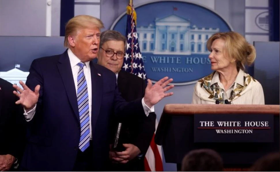 Tổng thống Mỹ Donald Trump, Bộ trưởng Tư pháp William Barr, bà Debbie Birx - bác sĩ, nhà ngoại giao, nhà điều phối phản ứng của đội đặc nhiệm chống COVID-19 của chính phủ Mỹ - họp báo tại Nhà Trắng ngày 23-4. Ảnh: REUTERS
