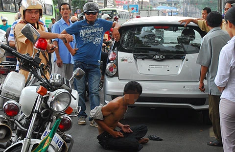 CSGT cùng người dân truy bắt một tên trộm trên đường Nguyễn Thị Minh Khai, quận 3, TP.HCM. Ảnh: HTD