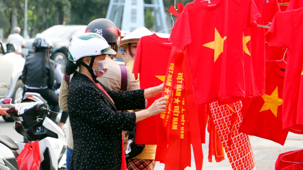 Nhiều người mua cờ, áo để chuẩn bị ăn mừng đội U-22 Việt Nam giành HCV SEA Games. Ảnh: CHÂU ANH
