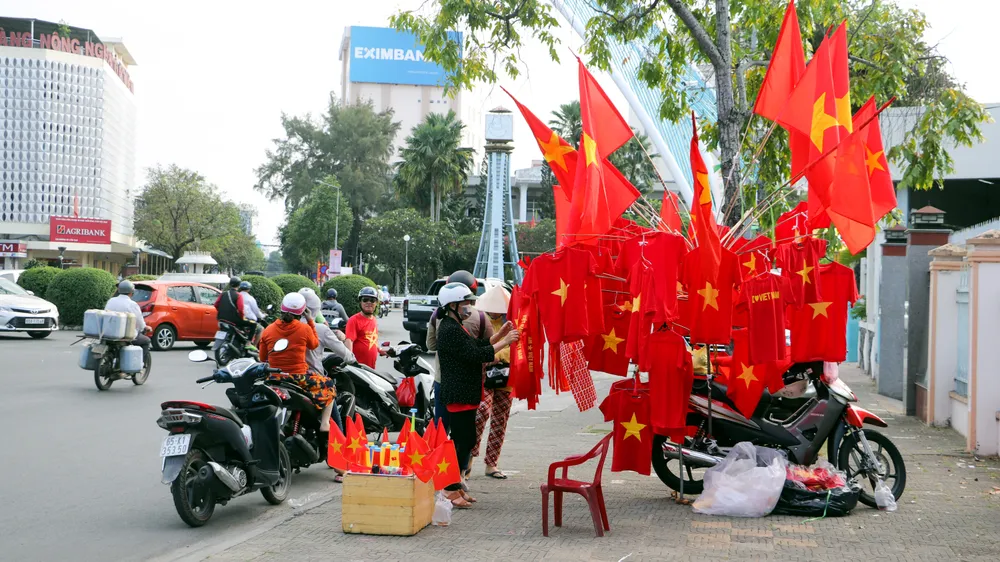 Một địa điểm bán cờ, áo trên đại lộ Hòa Bình (TP Cần Thơ). Ảnh: CHÂU ANH