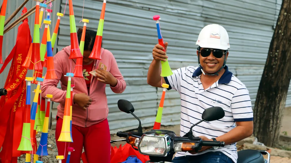 Theo ghi nhận, từ đại lộ Hòa Bình đến chợ Xuân Khánh có rất nhiều địa điểm bán cờ, áo và tất cả đang rất háo hức chờ đến giờ bóng lăn.