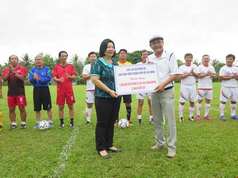 Anh cũng thường xuyên cùng các cầu thủ cựu sinh viên và bóng đá nữ TP.HCM đi các địa phương ủng hộ những người nghèo và địa phương khó khăn. Ảnh: CT