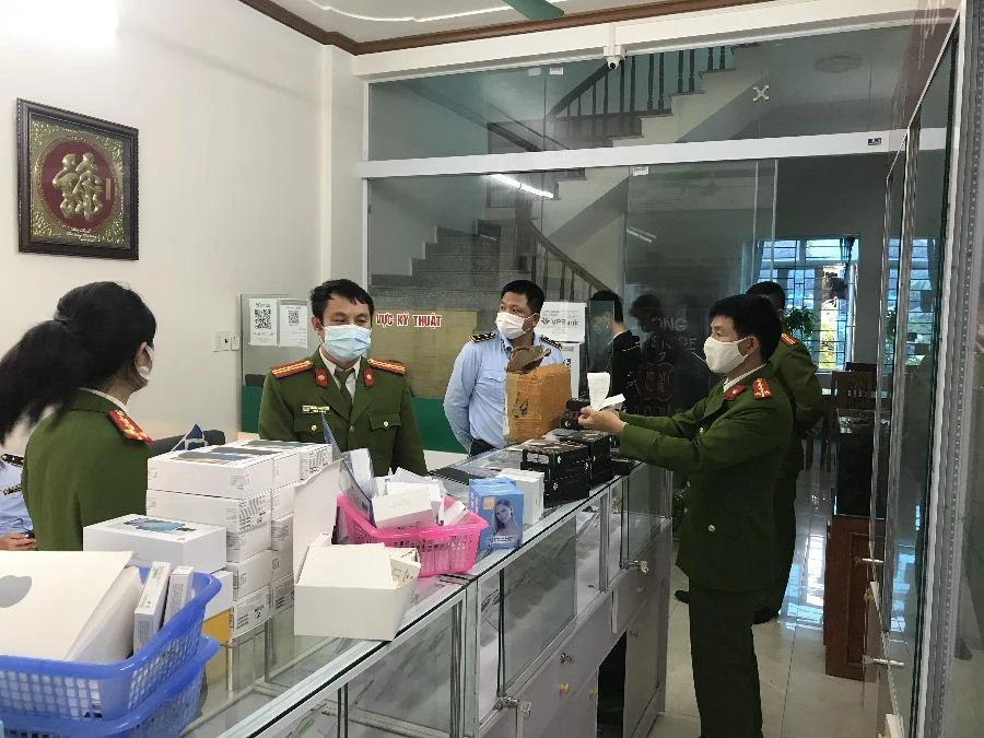 Lực lượng chức năng kiểm tra tại cơ sở kinh doanh điện thoại di động. Ảnh: DMS
