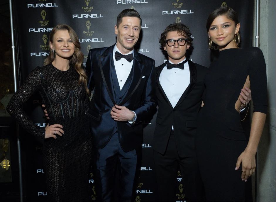 Ở hậu trường buổi lễ, Tom Holland và Zendaya chụp ảnh với nhiều cầu thủ nổi tiếng, đơn cử là Lewandowski.