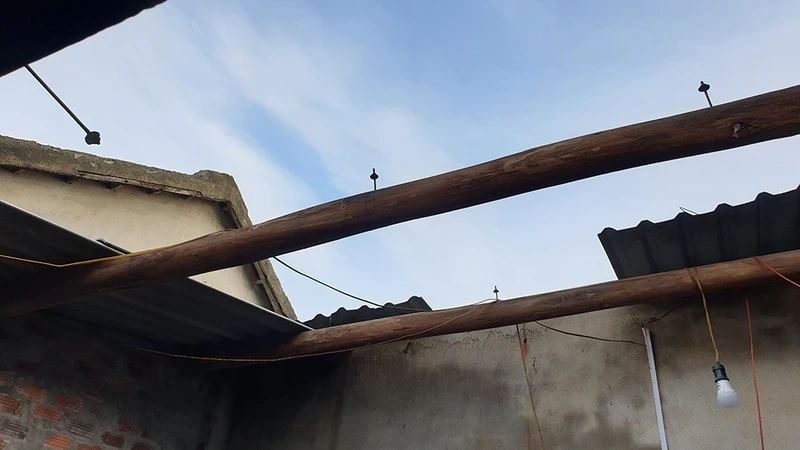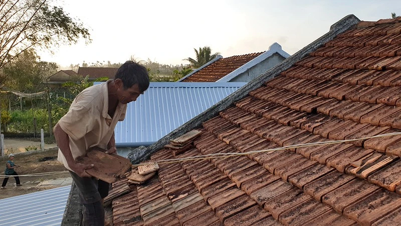 Người dân phải đi lùng, xin ngói nát của nhiều hộ dân trong xã để lợp lại căn nhà. Ảnh: TÂN TOÀN