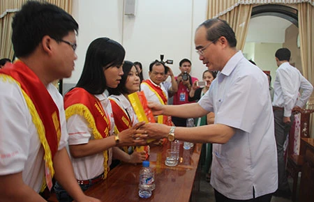 Chủ tịch Ủy ban Trung ương Mặt trận Tổ quốc Việt Nam Nguyễn Thiện Nhân tặng quà cho 100 cá nhân hiến máu tình nguyện tiêu biểu năm 2014. Ảnh: HUY HÀ