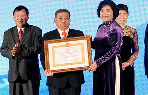 Thừa ủy quyền của Chủ tịch nước, Phó Chủ tịch UBND TP.HCM Nguyễn Thị Hồng trao tặng huân chương Lao động hạng Nhì cho Hiệp hội Doanh nhân TP.HCM. Ảnh: TTXVN