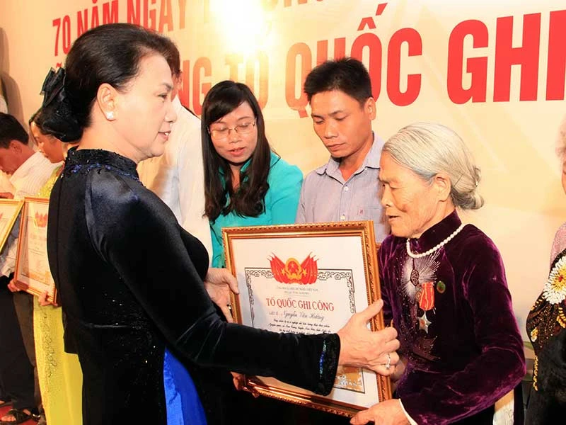 Chủ tịch Quốc hội Nguyễn Thị Kim Ngân trao bằng Tổ quốc ghi công cho các gia đình thân nhân liệt sĩ. Ảnh: TTXVN