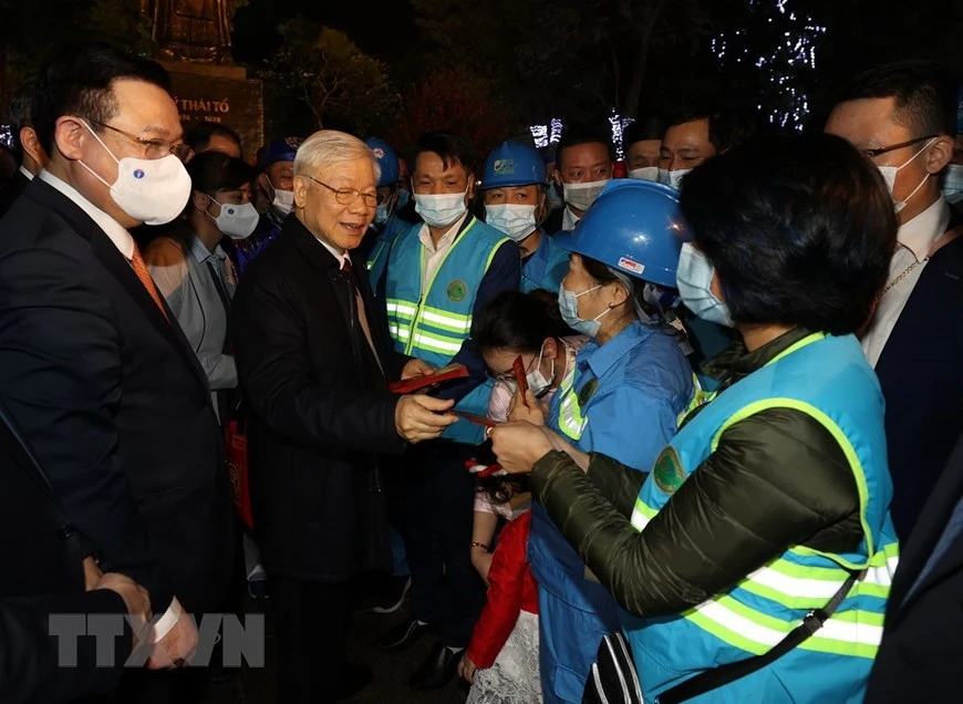 Tổng bí thư, Chủ tịch nước Nguyễn Phú Trọng thăm, chúc tết người lao động Thủ đô tại tượng đài Lý Thái Tổ. Ảnh: TTXVN