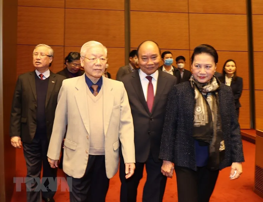 Tổng bí thư, Chủ tịch nước Nguyễn Phú Trọng, Thủ tướng Chính phủ Nguyễn Xuân Phúc, Chủ tịch Quốc hội Nguyễn Thị Kim Ngân, Thường trực Ban bí thư Trần Quốc Vượng đến dự hội nghị. Ảnh: TTXVN