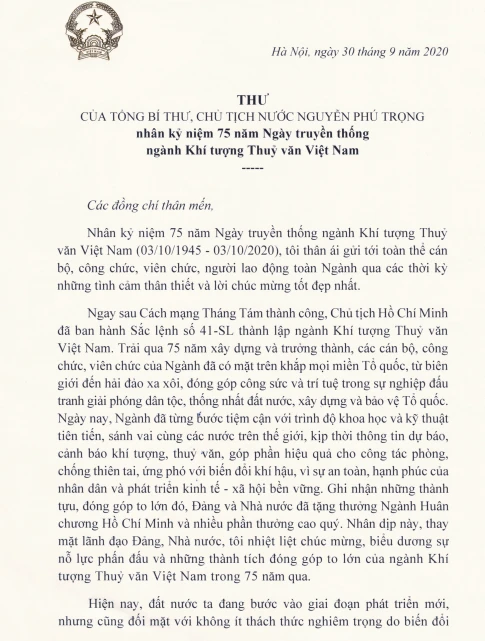 "Nhân dịp này, thay mặt lãnh đạo Đảng, Nhà nước, Tổng Bí thư, Chủ tịch nước nhiệt liệt chúc mừng, biểu dương sự nỗ lực phấn đấu và những thành tích đóng góp to lớn của ngành Khí tượng thuỷ văn Việt Nam trong 75 năm qua" - Tổng bí thư, Chủ tịch nước Nguyễn Phú Trọng viết trong thư.