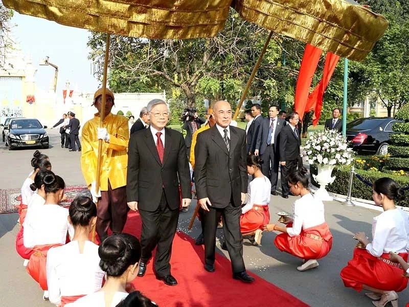 Quốc vương Campuchia Norodom Sihamoni đón Tổng Bí thư, Chủ tịch nước Nguyễn Phú Trọng. Ảnh: TTXVN