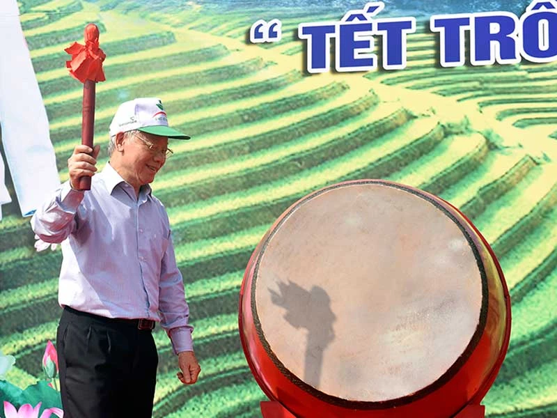 Tổng Bí thư, Chủ tịch nước Nguyễn Phú Trọng đánh trống phát động Tết trồng cây. Ảnh: VGP/NHẬT BẮC