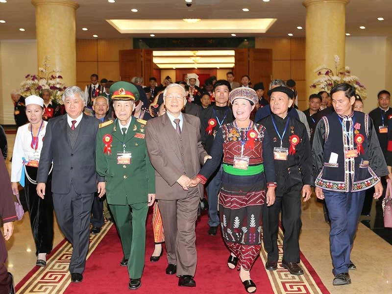 Tổng Bí thư Nguyễn Phú Trọng với các đại biểu là người có uy tín, nhân sĩ trí thức, doanh nhân dân tộc thiểu số tiêu biểu toàn quốc. Ảnh: TTXVN