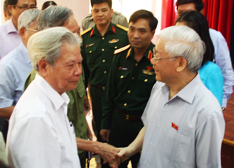 Tổng Bí thư Nguyễn Phú Trọng tiếp xúc với cử tri quận Ba Đình sáng nay, 17-10.