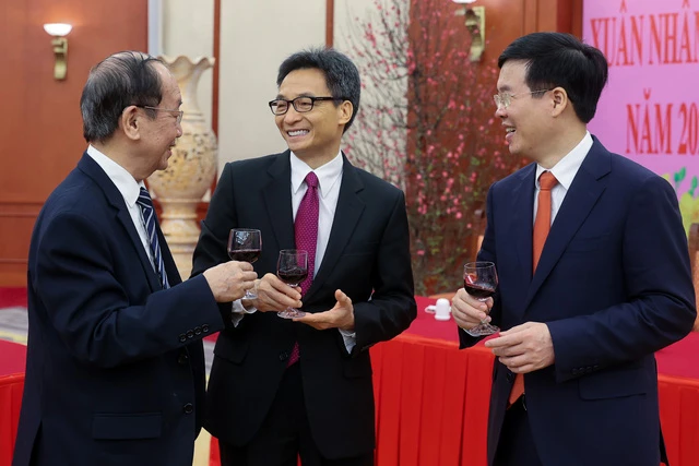 Các lãnh đạo, nguyên lãnh đạo nâng ly chúc mừng năm mới. Ảnh: VGP