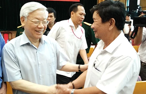 Tổng Bí thư Nguyễn Phú Trọng đang thăm hỏi cử tri quận Ba Đình. Ảnh: TRỌNG PHÚ