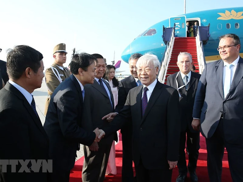 Lễ đón chính thức Tổng Bí thư Nguyễn Phú Trọng và đoàn đại biểu cấp cao Việt Nam được tổ chức trọng thể tại sân bay quốc tế Ferenc Lizt, thủ đô Budapest.