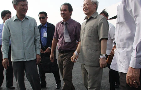 Nhân dịp này, sáng qua (13-4), Tổng Bí thư Nguyễn Phú Trọng cùng đoàn đại biểu cấp cao Việt Nam và Lào đã đến Trung tâm điều hành Tập đoàn Hoàng Anh Gia Lai (HAGL) ở tỉnh Attapeu (ảnh) để thăm và nói chuyện với nhiều doanh nghiệp Việt Nam (DNVN) đầu tư vào Lào. Tại đây, Chủ tịch Tập đoàn HAGL, ông Đoàn Nguyên Đức, báo cáo: HAGL hiện là DNVN đầu tư lớn nhất ở Lào với số vốn trên 1 tỉ USD, gồm cụm công nghiệp mía đường, sáu nhà máy thủy điện; trồng cao su, cọ dầu, bắp, mía trên diện tích 40.000 ha… giải quyết việc làm cho hơn 10.000 lao động địa phương.