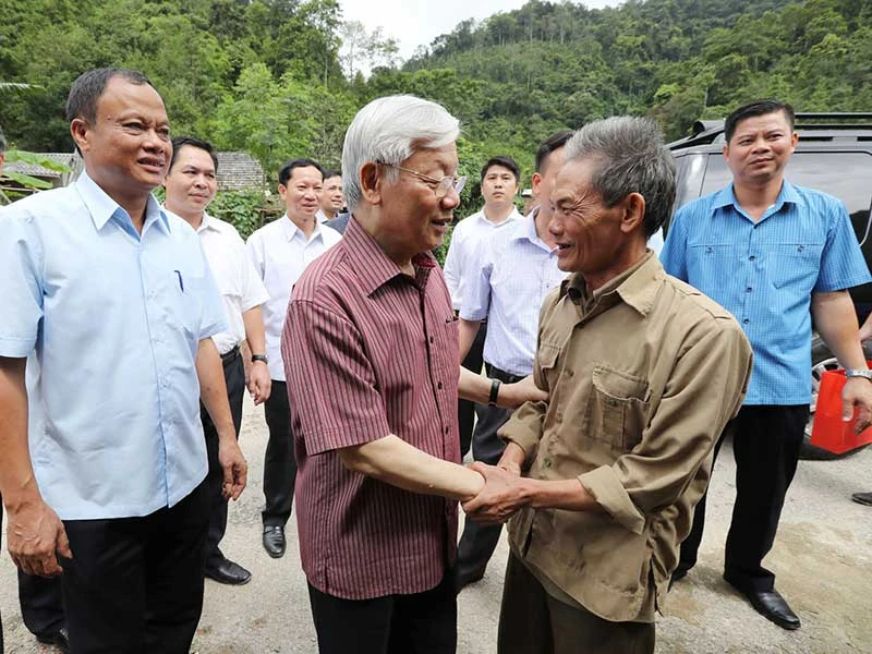 Tổng Bí thư Nguyễn Phú Trọng đến thăm, tặng quà ông Nông Đức Phấn, hộ cận nghèo, dân tộc Tày ở thôn Nà Loạn, xã Sĩ Bình, huyện Bạch Thông, Bắc Kạn. Ảnh: TTXVN
