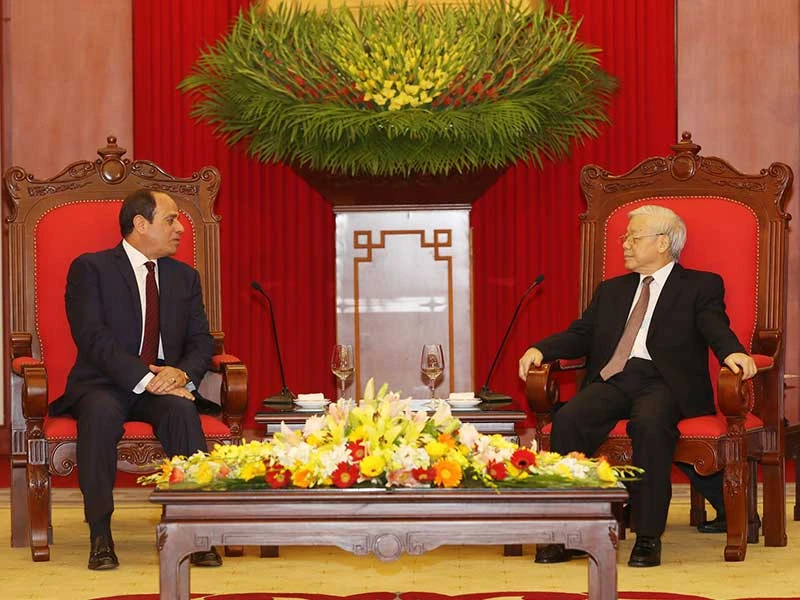 Tổng Bí thư Nguyễn Phú Trọng nhiệt liệt hoan nghênh Tổng thống Abdel Fattah Al Sisi thăm Việt Nam và cho rằng chuyến thăm Việt Nam đầu tiên của một tổng thống Ai Cập sẽ là dấu mốc lịch sử mở ra giai đoạn phát triển mới tốt đẹp hơn nữa cho quan hệ hữu nghị truyền thống giữa hai nước mà Chủ tịch Hồ Chí Minh là người đặt nền móng…