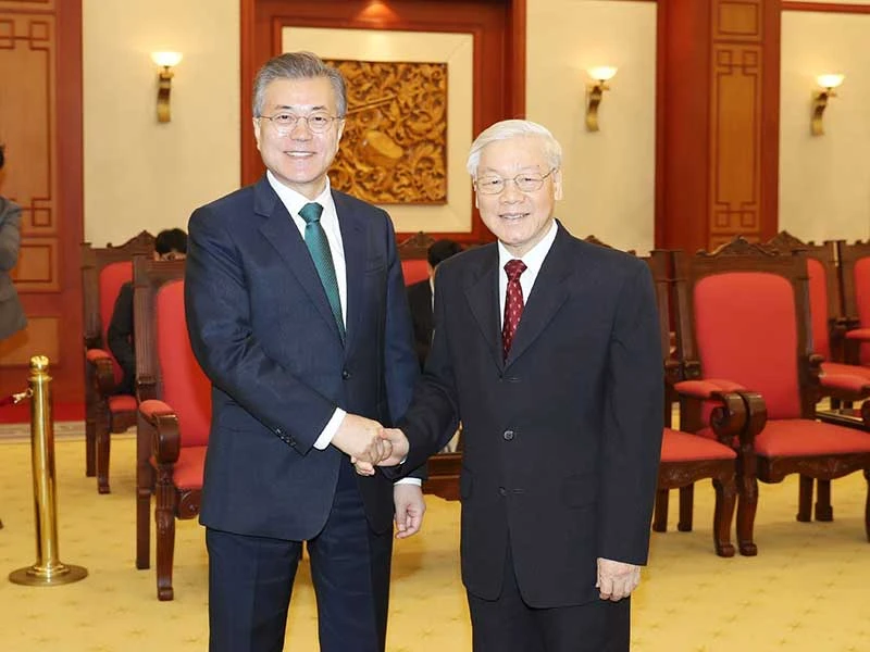 Tổng Bí thư Nguyễn Phú Trọng tiếp Tổng thống Hàn Quốc Moon Jae-in. Ảnh: TTXVN