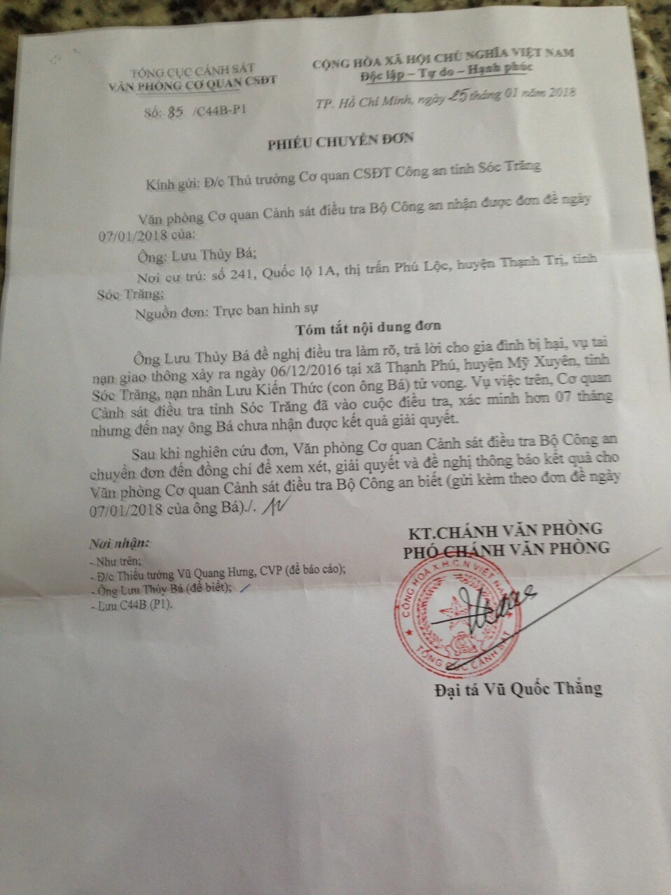 Văn phòng cơ quan CSĐT (Bộ Công an) vừa có phiếu chuyển đơn của ông Lưu Thủy Bá (cha người đi bộ bị tông chết) đến Thủ trưởng Cơ quan CSĐT công an tỉnh Sóc trăng xem xét giải quyết và đề nghị thông báo kết quả cho Văn phòng cơ quan CSĐT biết.