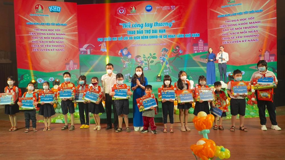 Nhân dịp này, Hội đồng Đội Trung ương, Công ty Cổ phần Sữa Quốc tế (IDP) - thương hiệu Sữa Kun và Công ty Cổ phần Chứng khoán Bản Việt tiếp tục trao bảo trợ cho các thiếu nhi mồ côi cha mẹ do dịch bệnh Covid-19 với gần 500 em được bảo trợ trên cả nước.