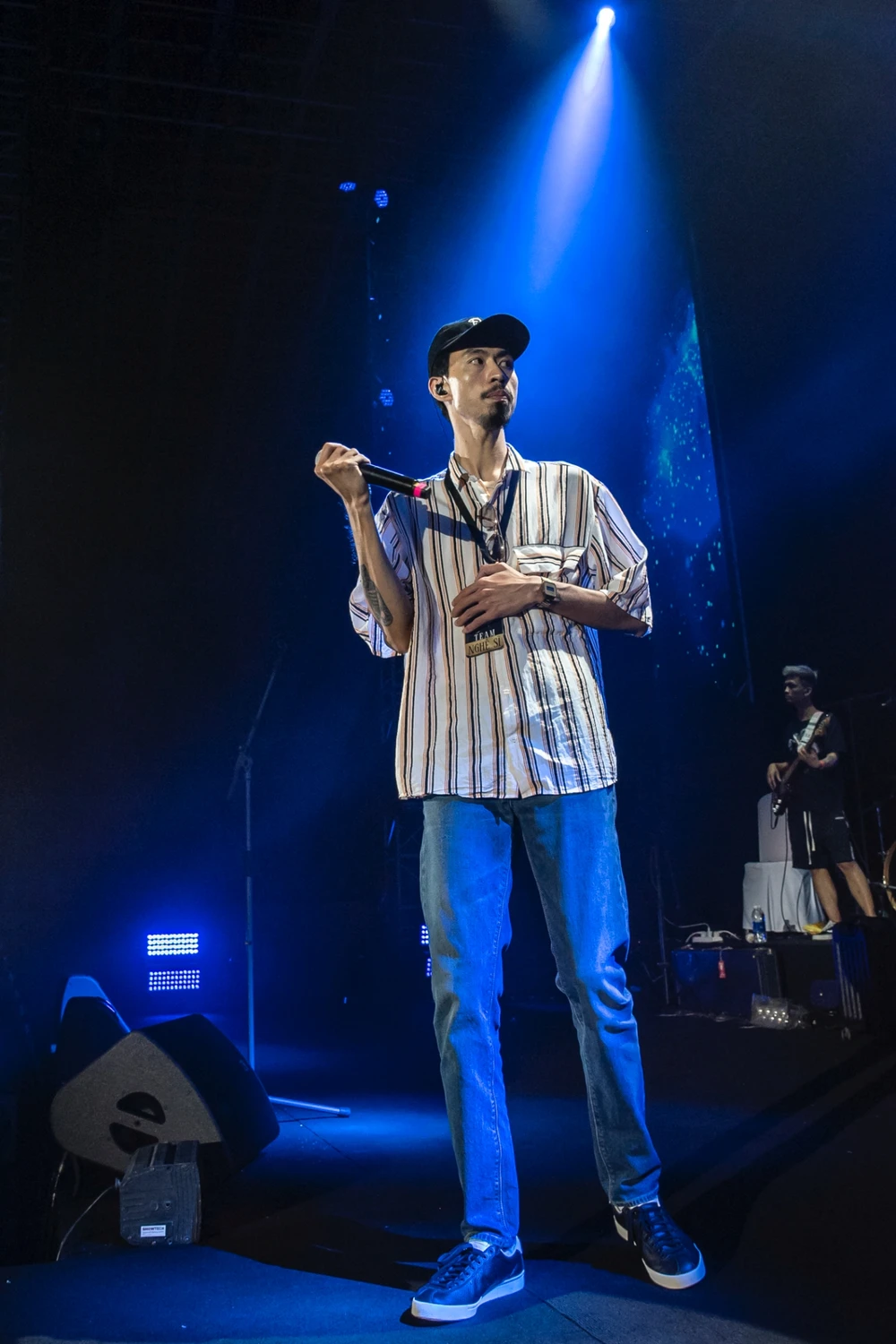 Đen Vâu chọn trang phục đơn giản, bụi bặm với áo sơ mi và quần jean. Anh chia sẻ mình đang rất hào hứng với những tiết mục trình diễn đặc biệt được anh chuẩn bị dành riêng cho các Đồng âm (tên fanclub của Đen Vâu) trong liveshow Show của Đen. Nam rapper liên tục thảo luận cùng tổng đạo diễn Long Halo trong quá trình tập luyện với ban nhạc Màu Nước.