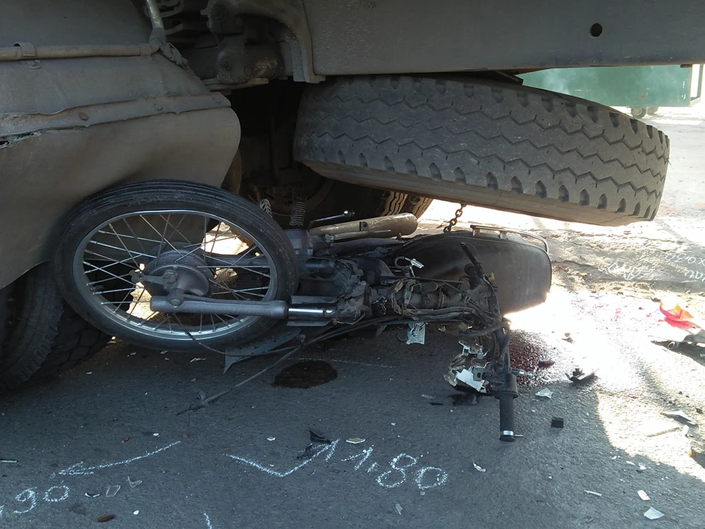 Chiếc xe máy biến dạng hoàn toàn, mắc kẹt dưới gầm xe tải. Ảnh: H.TÂM