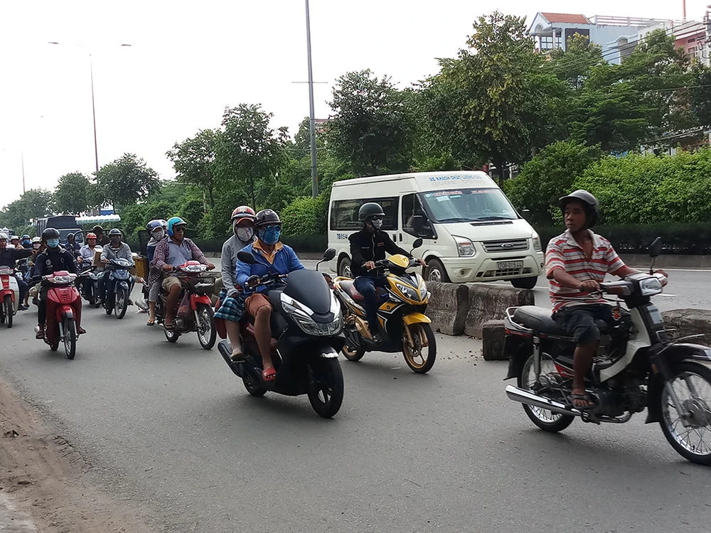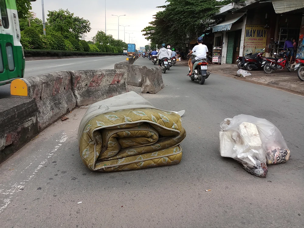 Theo quan sát, nhiều mảng bê tông dải phân cách bị tông văng, xê dịch ra khỏi vị trí sang làn xe hai bánh khiến giao thông khu vực gặp khó khăn khi di chuyển qua.