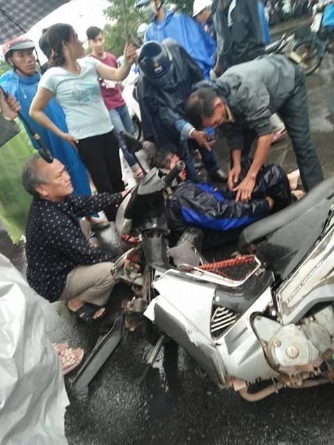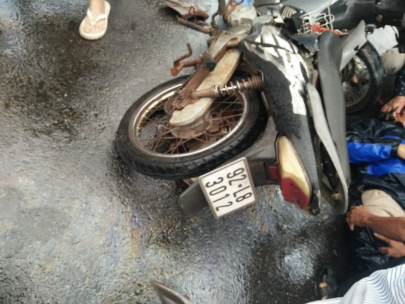 Cú va chạm mạnh khiến người đàn ông ngã ra đường bị thương năng ở phần chân và phần đầu. Chiếc xe máy gãy đôi, nhiều mảnh vở tung tóe khắp đường.