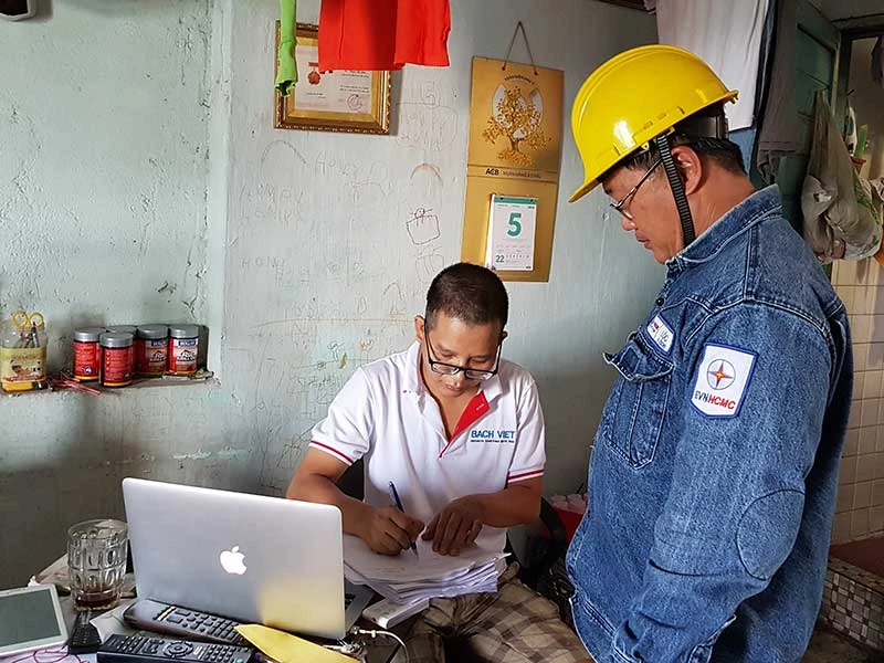 Anh Hoàng Đình Thọ (ngụ 14/8/2 Nguyễn Thị Nghĩa, quận 1, TP.HCM) ký biên bản xác nhận an toàn điện. Ảnh: EVNHCMC